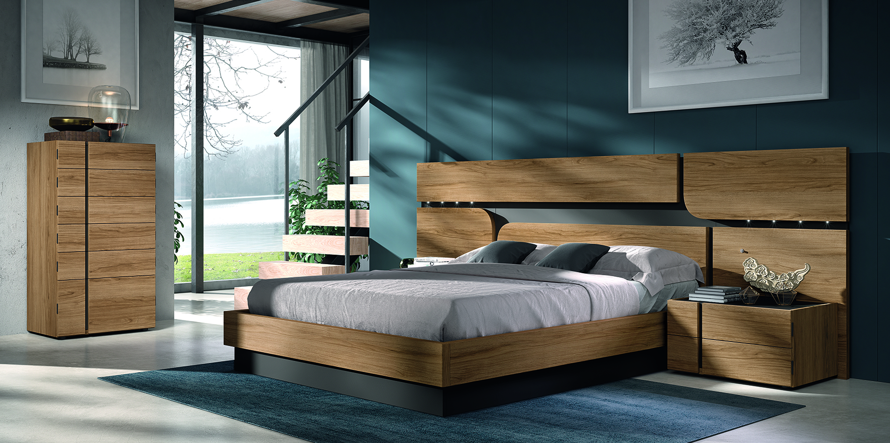 Dormitorio de matrimonio colección Génova, combina líneas rectas con curvas dando un diseño mas dinámico y natural.