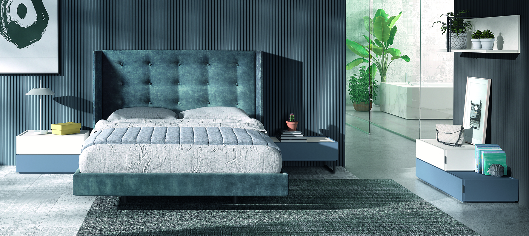 Colores de la composición: Blanco Lacado , Cobalto Lacado y tapizado Fuji 18