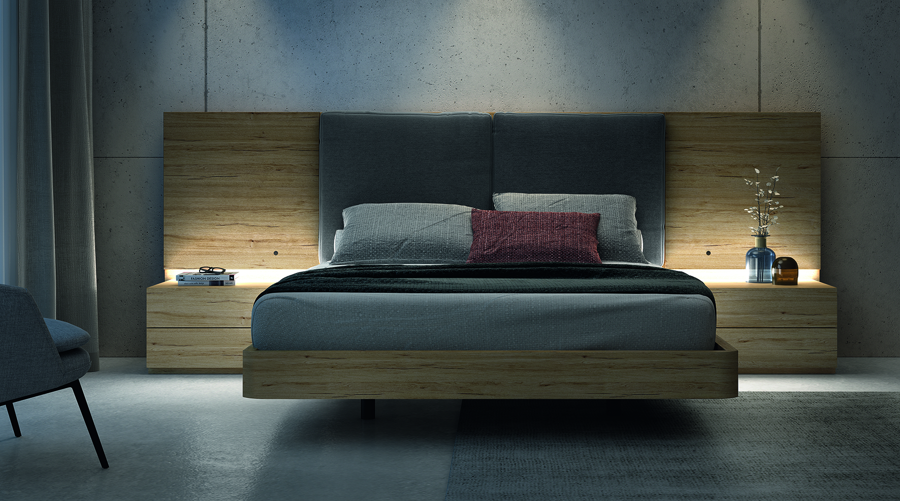 Dormitorio de matrimonio colección Indy, cabecero combinado en laminados y tapizado, muy cómodo como cabecero de lectura.