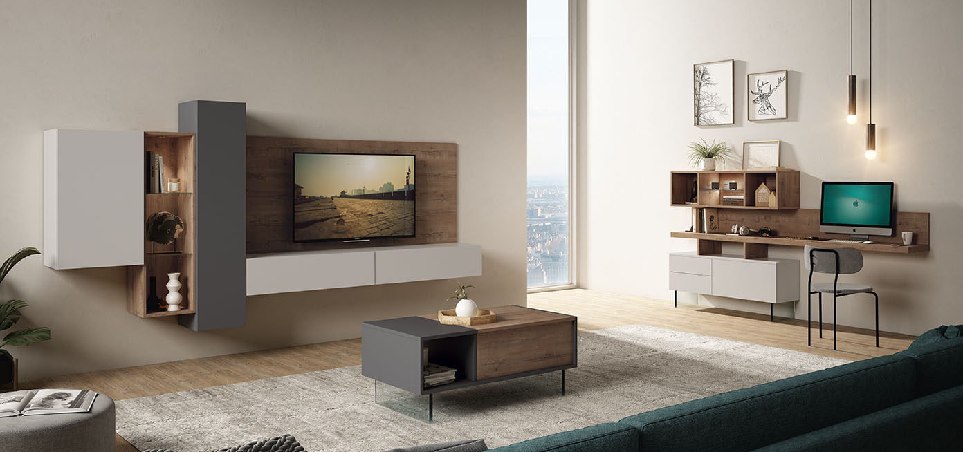 Composición con piezas que nos hacen la vida mas fácil. Aquí podemos ver un aparador escritorio para esa zona de la casa donde organizar trabajo o estudio. Todo perfectamente integrado en un salón, composición y zona de estudio a la vez.