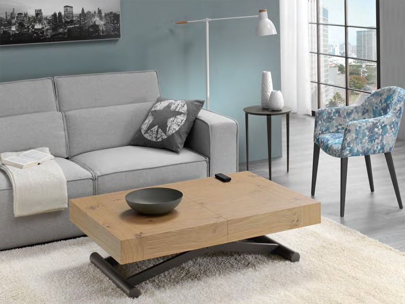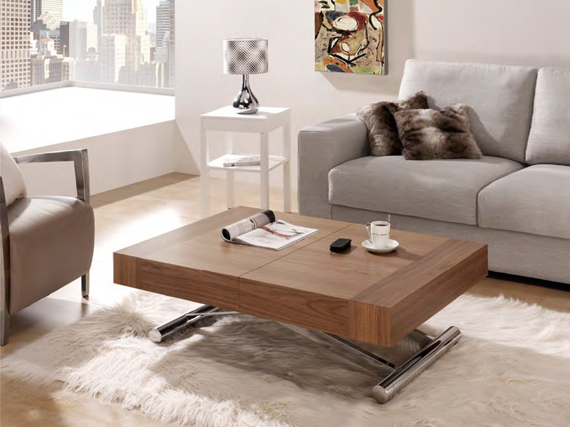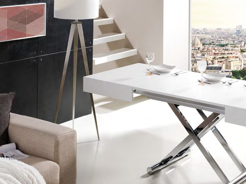 Mesa de centro convertible Indesan de la colección «ACTIVA», de diseño funcional, moderno y sofisticado. Se puede regular en altura y apertura para convertirse de mesa de centro a mesa de comedor. Con opciones de distintos acabados em maderas o lacados, patas de acero texturizado o acero inoxidable cromado.