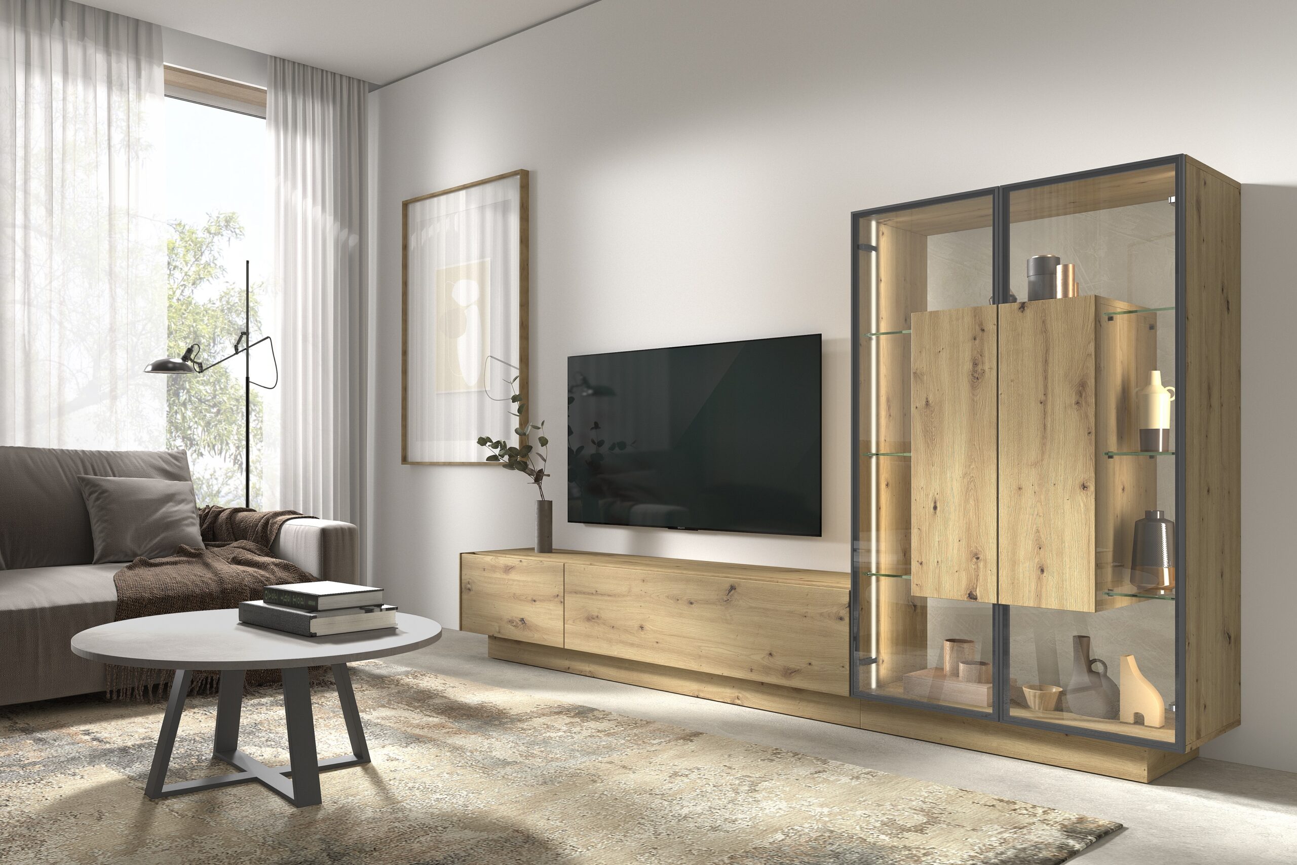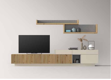 Composición modular salón KAZZANO promoción , compuesta por varios módulos con puertas Y vitrina de dos puertas. Combinación de colores a elegir.